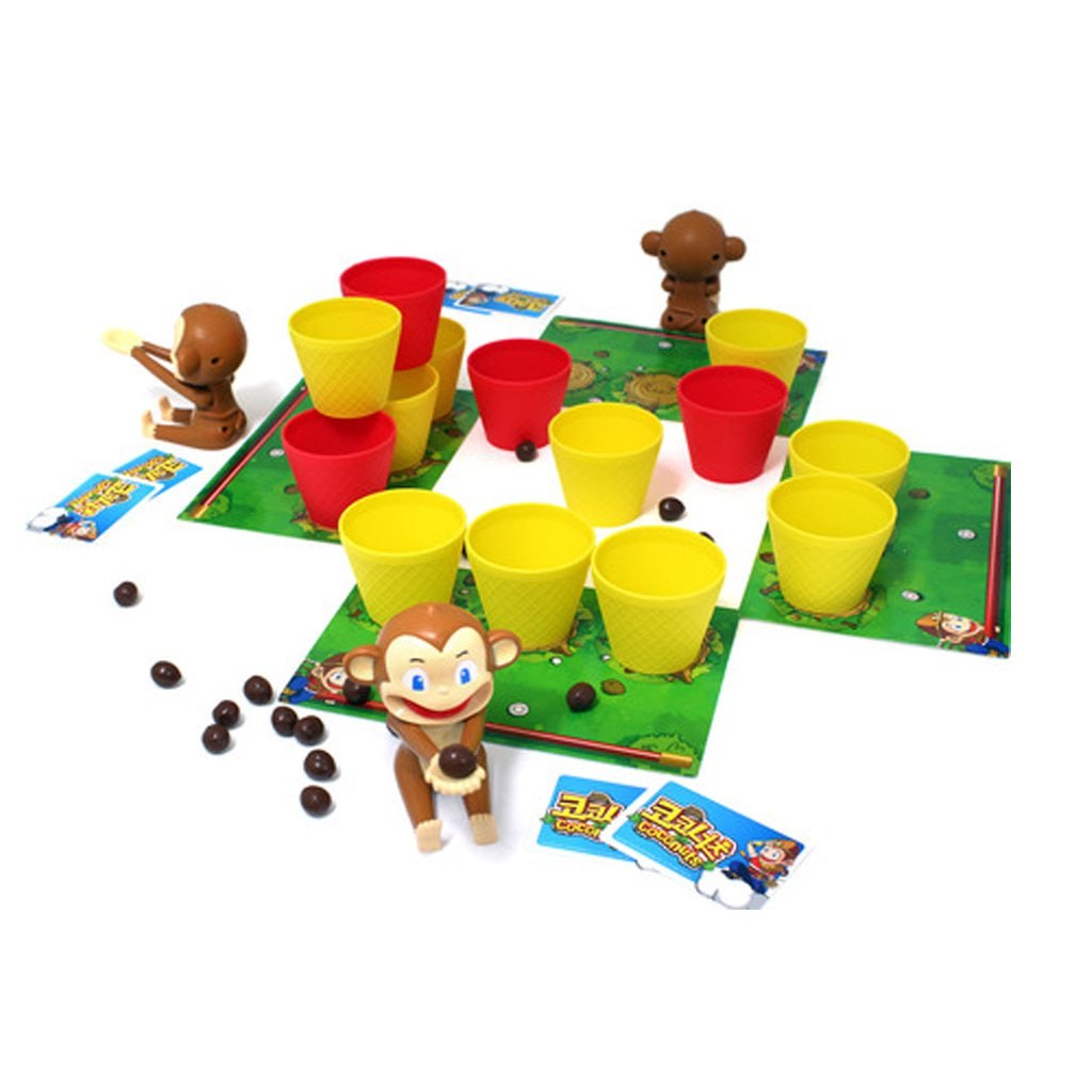 - У каждого игрока есть своя игровая зона, в которой он будет использовать специальную мартышку – катапульту. В свой ход игрок кладёт один кокос в лапы обезьянке и... запускает его в неизвестность... Задача проста – попасть в один из стаканчиков, расположенных на игровом столе. Попал? Забирай стаканчик себе и ставь на одну из круглых отметок у себя на игровом планшете. Ход переходит другому игроку. Если попадание в красный стаканчик, тогда даётся право на дополнительный бросок;