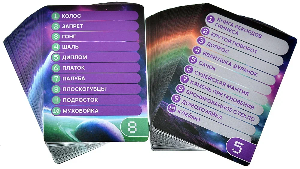 Правила хода предельно просты, что делает игру доступной даже для тех, кто редко играет в настолки. В начале раунда ведущий смотрит на верхнюю карту заданий и обращает внимание на число, указанное в её верхней части. Рядом с этим номером напечатаны два варианта слов, например «дырокол» и «светофор», и именно из них нужно выбрать одно для объяснения. Такой выбор позволяет подстроить сложность под себя: можно взять слово полегче или, наоборот, посложнее и поинтереснее.